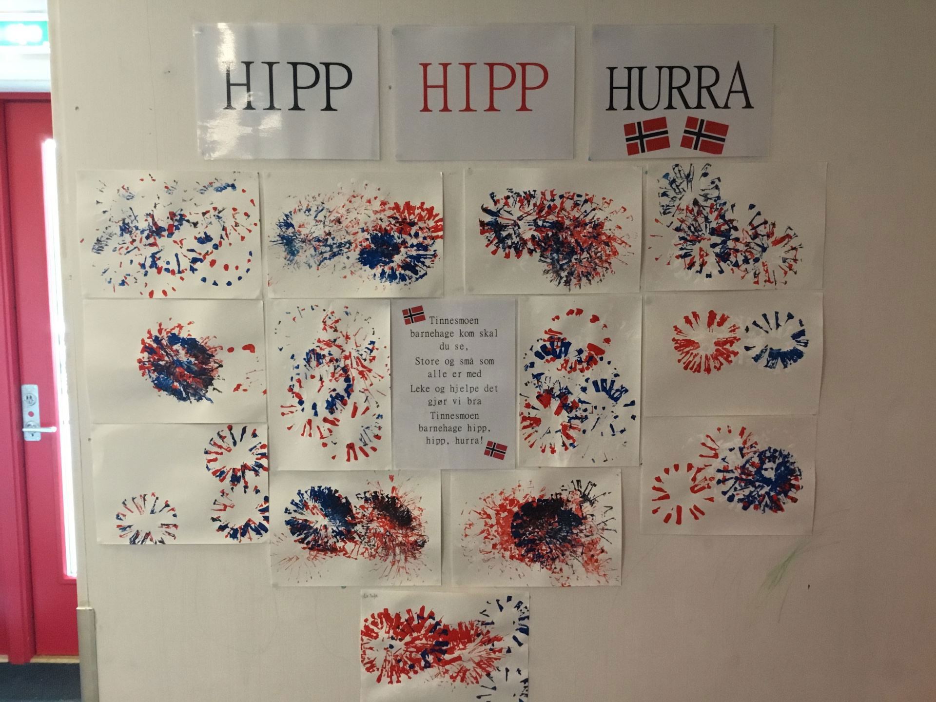 På de ulike avdelingene har vi hatt samlinger om nasjonaldagen, tilpasset etter alderen til barna. For de minste er det spennende å vifte med flagget og synge sanger som passer. De litt større har fått et forhold til bursdag, og vi har snakket om at Norge har bursdag og det feirer vi med flagg og heiarop. Vi har studert flagget og hatt ulike kreative prosjekter på de forskjellige avdelingene. Barna er ivrige på barnehagens heiarop: